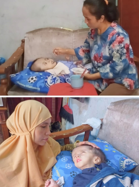 Sejak usia 4 bulan, Theo Danantya Suryadilaga (3 tahun) harus berjuang melawan hidrosefalus. Kepalanya terus membesar hingga kini, sementara tubuh mungilnya semakin melemah hanya menyisakan tulang. Theo sempat menjalani operasi pertama di RS Hermina Bandung, namun langkah pengobatannya terhenti karena BPJS tidak lagi aktif dan keluarga tak mampu menanggung biaya rumah sakit. Kini, Theo hanya bisa dirawat di rumah dengan obat seadanya, padahal seharusnya ia segera mendapatkan tindakan lanjutan di RS Hasan Sadikin Bandung.