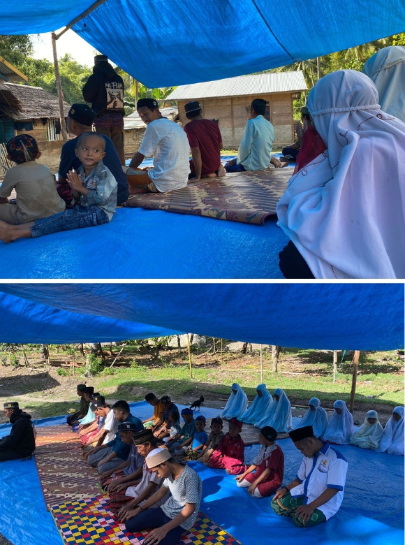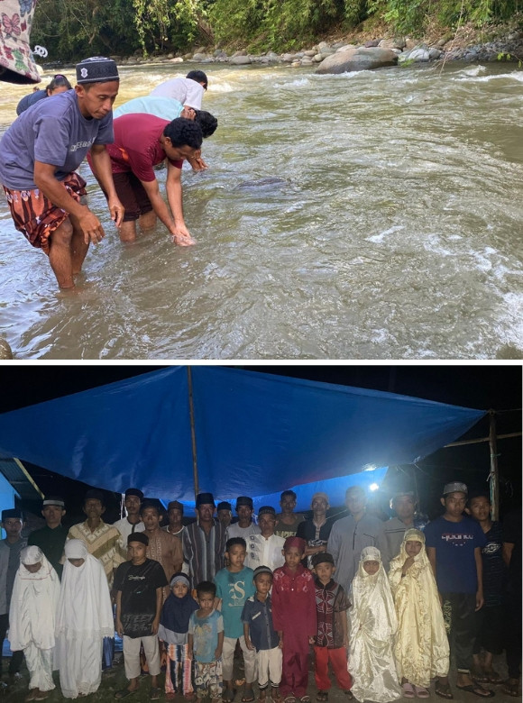 Karena keterbatasan itu, warga berinisiatif membangun masjid sederhana seadanya, beralaskan terpal tanpa dinding kokoh. Untuk berwudhu, mereka masih mengandalkan aliran sungai yang sama digunakan untuk mandi dan minum. Tak jarang ada yang terpeleset bahkan hampir hanyut demi bisa bersujud kepada Allah. Meski penuh risiko, semangat mereka untuk beribadah dan belajar Islam tak pernah surut.